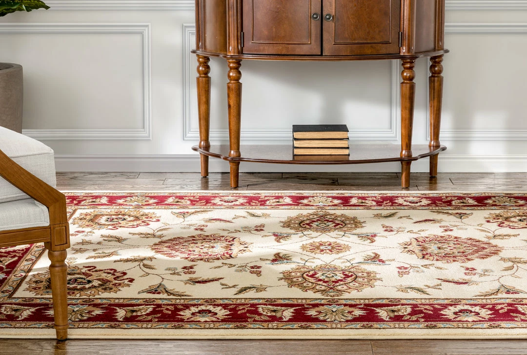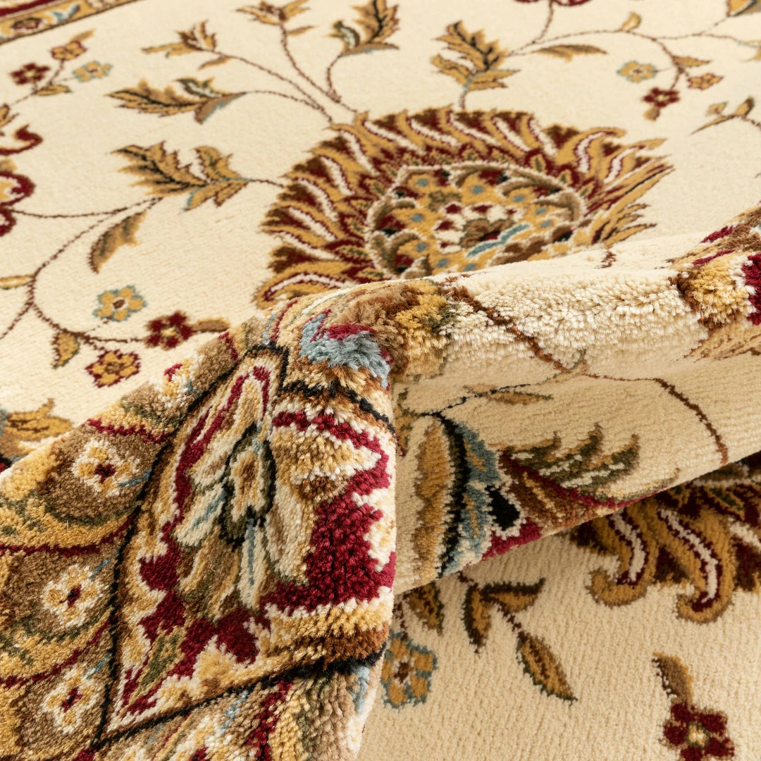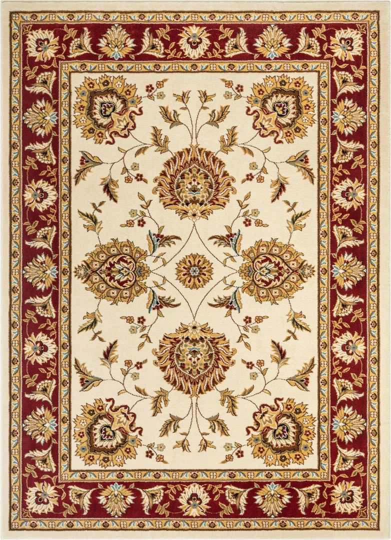 Timeless rugs are the perfect blend of quality and class. Rooted firmly in traditional designs, Timeless pays homage to the classic Oriental, Arabic, and European styles. Detailed floral medallions, sarouks, fleur de lis, and lattice prints are woven in a palette of warm, neutral ivory and beige, with vibrant jewel tone colors to bring the collection to life. The plush, 0.5″ heat-set polypropylene pile gives an exceptionally textured look. This yarn is velvety soft, stain resistant, and doesn’tfade over time. Perfectly suited for the luxurious yet active lifestyle and built to last for years