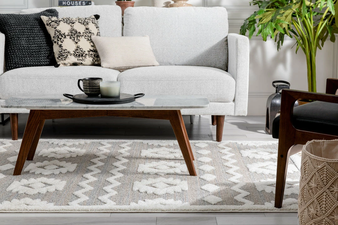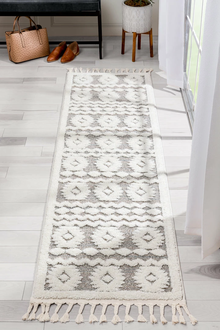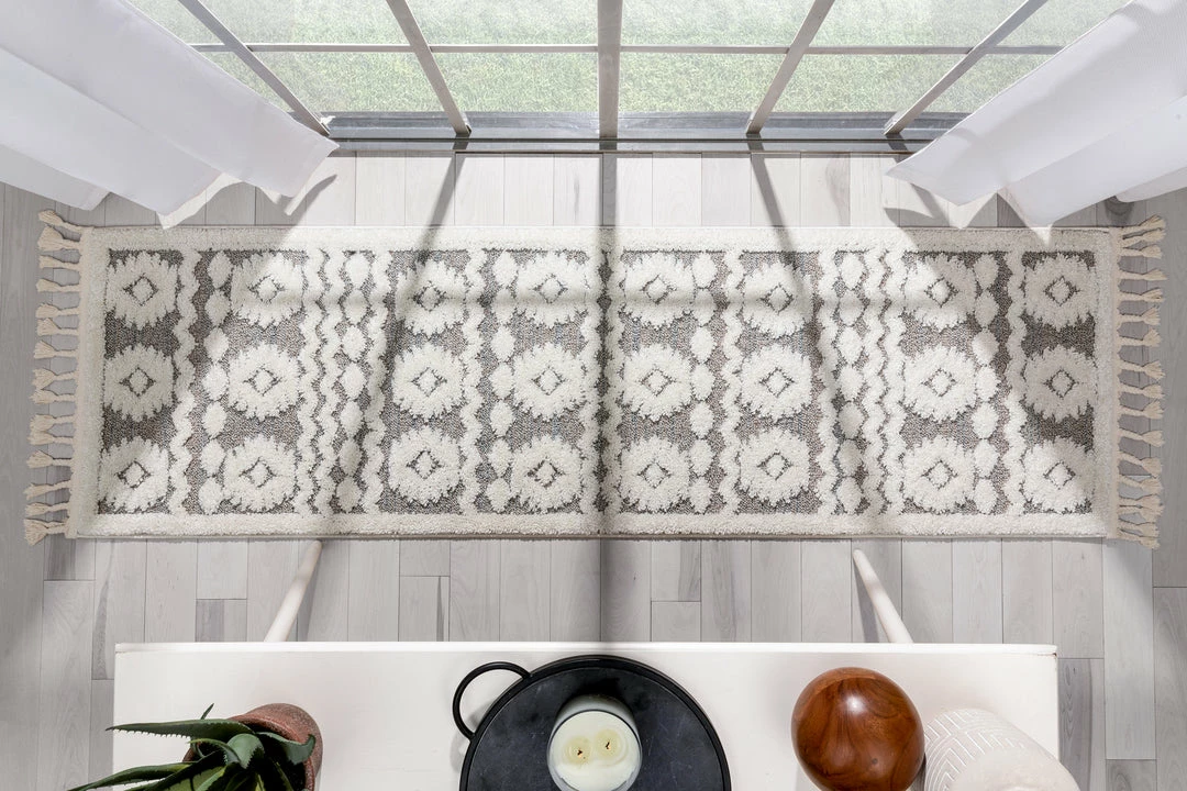 The Salem Collection’s globally inspired, distressed tribal patterns make the perfect centerpiece to a calming space. Ground yourself on a dense, looped pile that features soft, high-low pattern accents lending plushness and a rustic, chunky texture. Breathe easy knowing the yarn is stain resistant and easy to clean while the jute backing is wood floor safe.