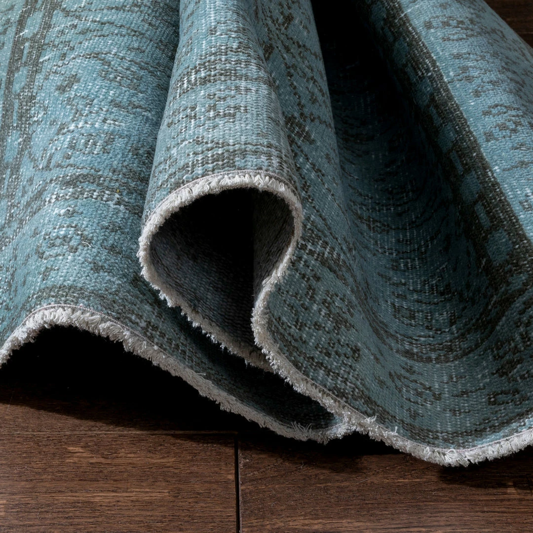 Ardin dazzles with vintage style and a distressing that’s more than just a look. Their unique overdyed floral botanical border pattern is woven in a rich array of light blue and grey colors. It’s the combination of affordability and ease-of-use you expect from a machine-made rug with the history, character and style you can only get from an heirloom vintage one.