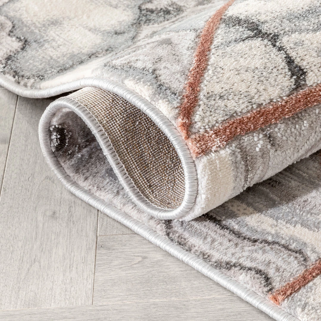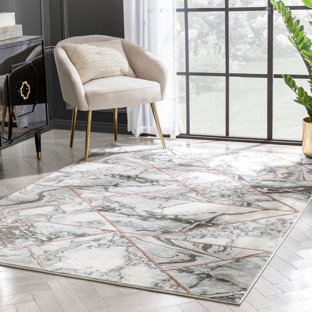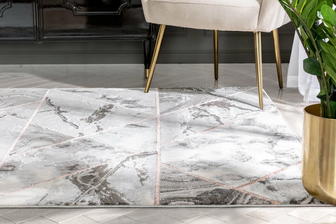 A collection of sleek, abstract designs with a soft hand and modern style. The geometric designs are woven in sharp grey tones, accented with shimmering pops of color, making these nouveau looks the understated companion to chic and glamorous decor.