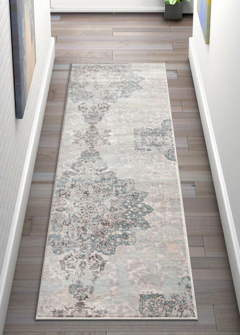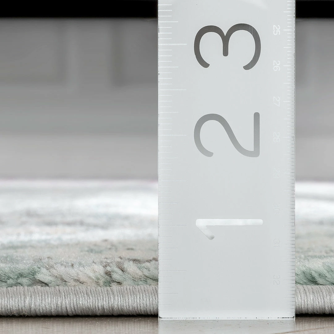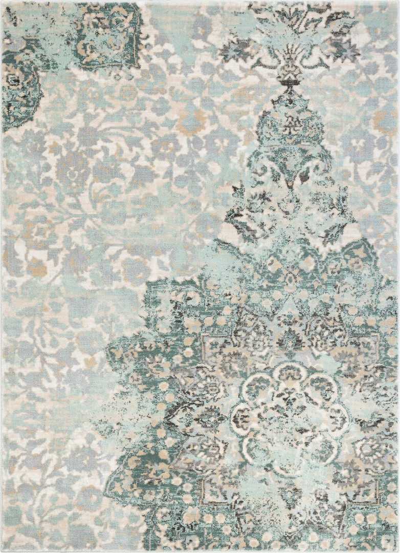 A unique collection where vintage soul meets modern traditional styling add a burst of personality and complete the look of any room. The Ciato Blue features an oversized version of a classic damask pattern, updated with a modern and subtle color palette of light and dark mint blue and dusty gold. These colors are offset and complemented with grey, beige and neutral ivory. Additionally, an intentionally distressed brush effect lends a look to the rug that is feels both modern and vintage.