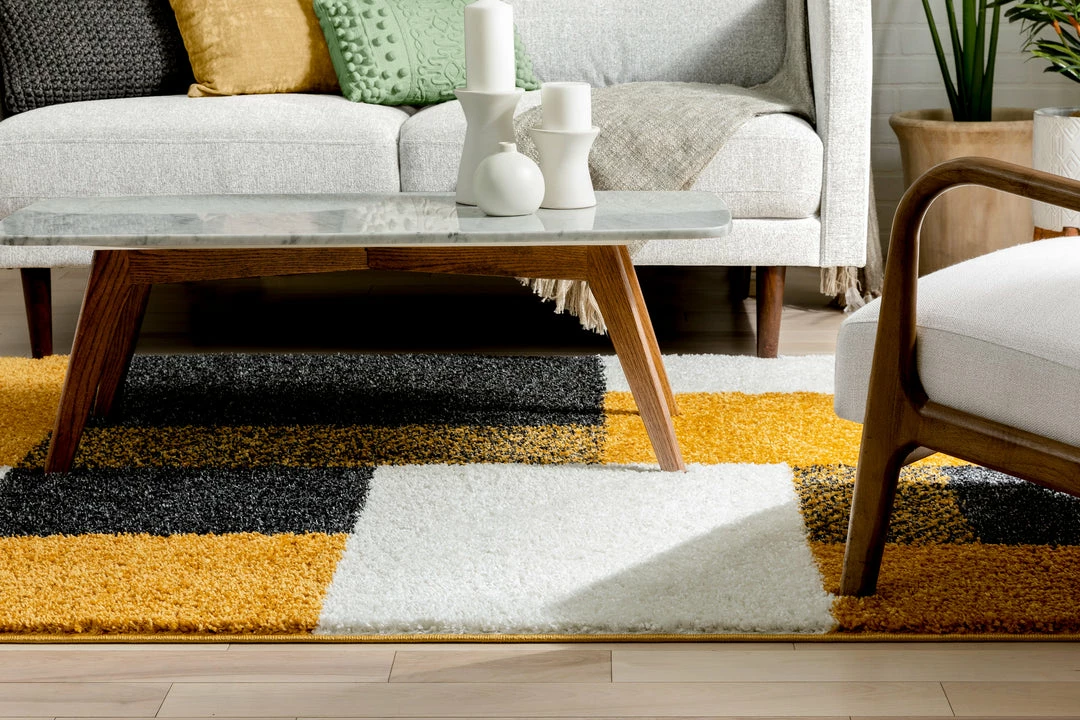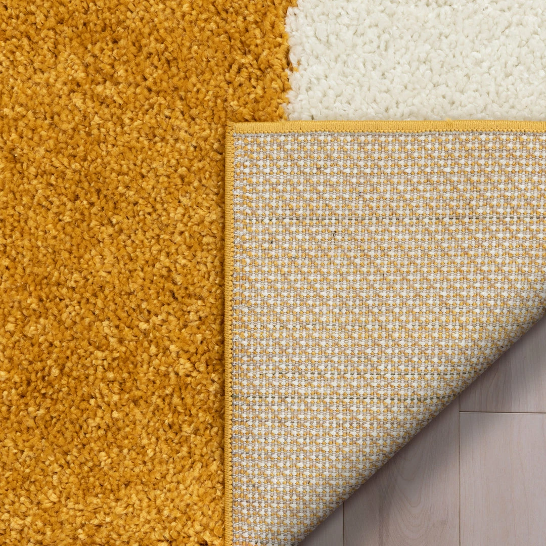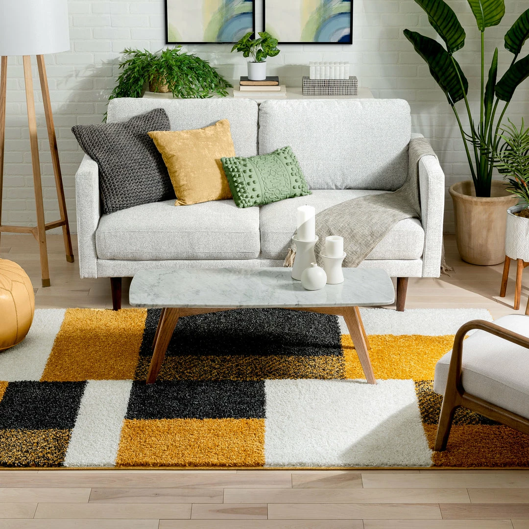 Well Woven Cubes Geometric Boxes & Squares Gold Grey Thick Shag Rug