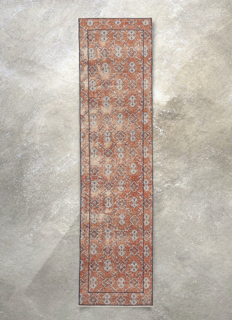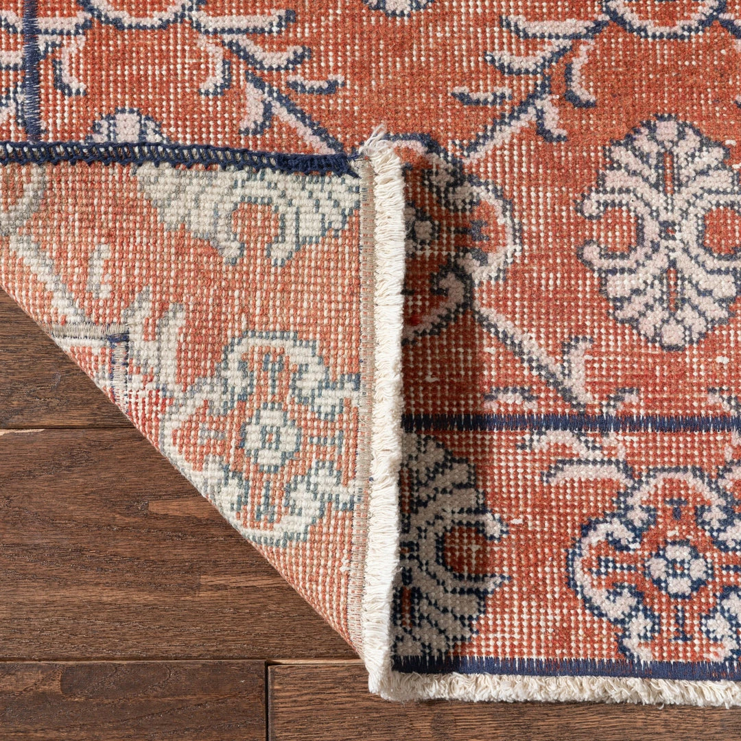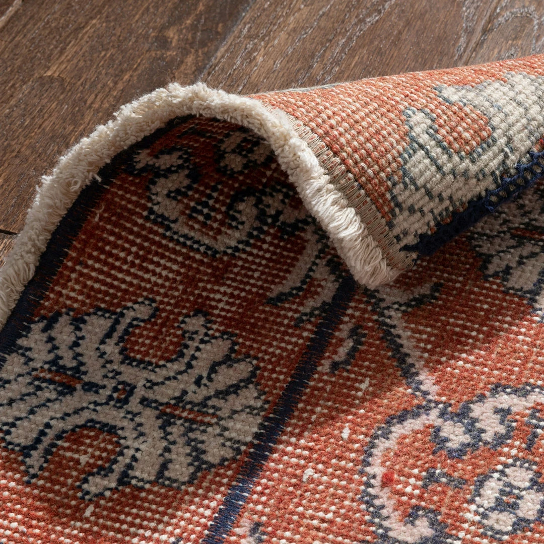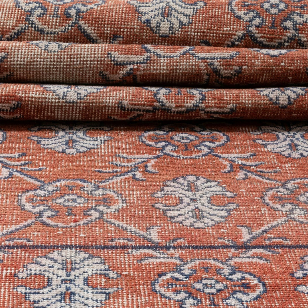 Enza has been cleaned, restored, and refreshed, ready to roll out in your home. They may have age-and-use-related blemishes and natural inconsistencies that are a unique part of the personality of each of these handcrafted vintage rugs.