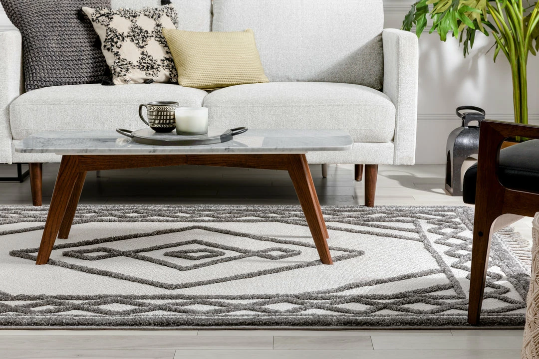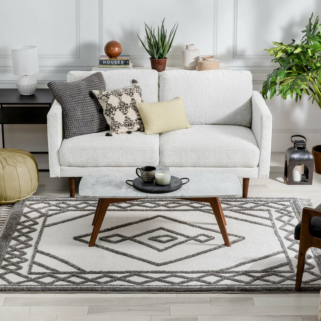 The Salem Collection’s globally inspired, distressed tribal patterns make the perfect centerpiece to a calming space. Ground yourself on a dense, looped pile that features soft, high-low pattern accents lending plushness and a rustic, chunky texture. Breathe easy knowing the yarn is stain resistant and easy to clean while the jute backing is wood floor safe.