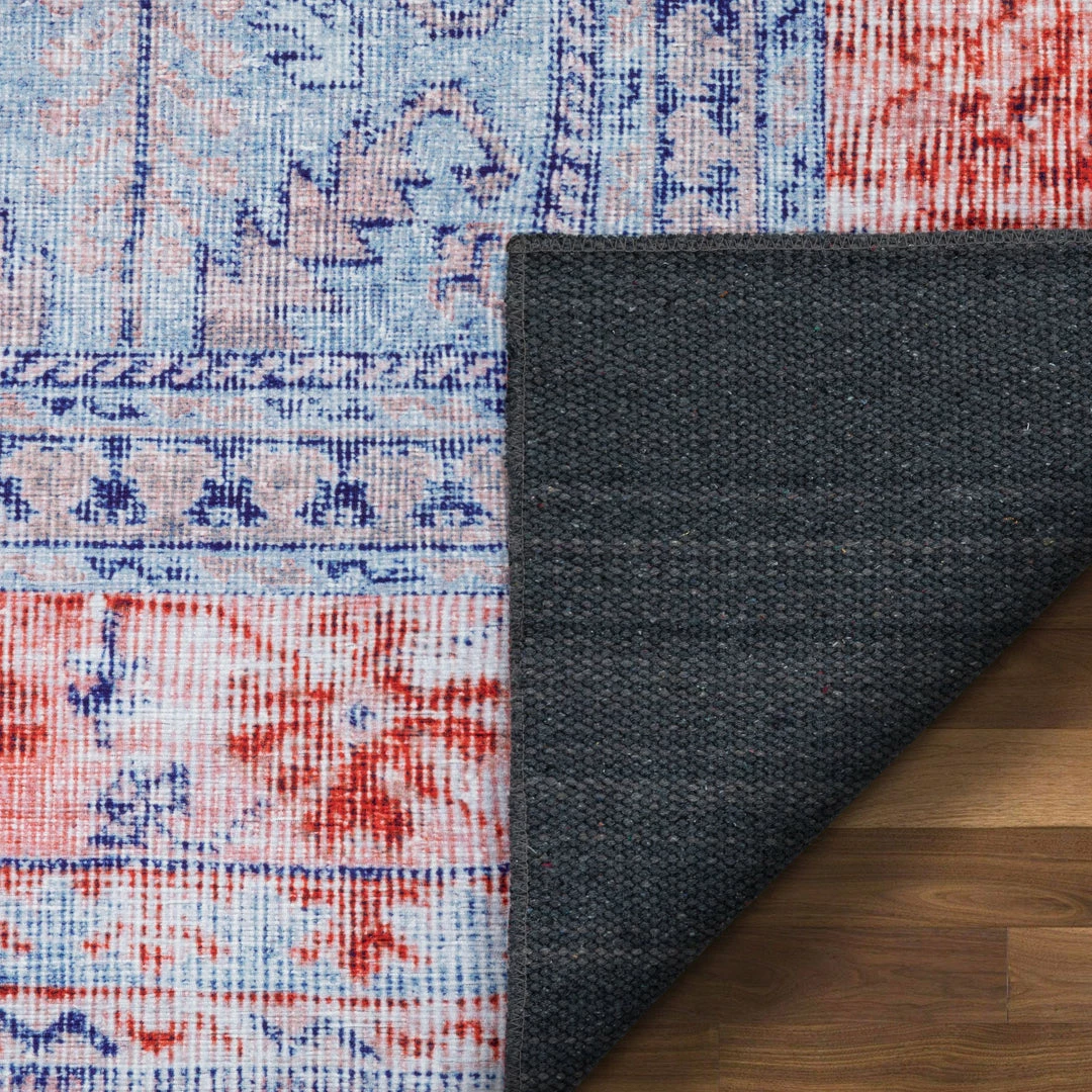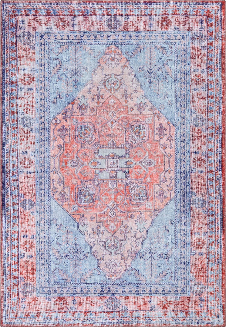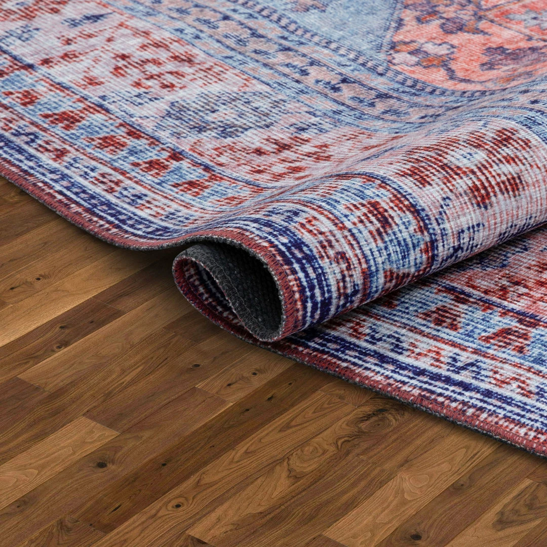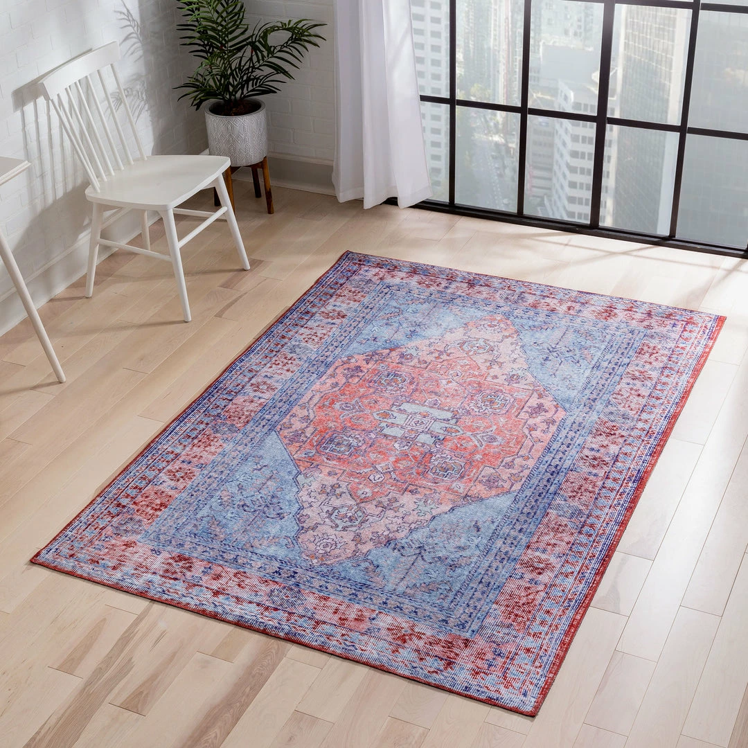 Well Woven Gila Machine Washable Vintage Bohemian Medallion Oriental Blue Red Flat-Weave Distressed Rug