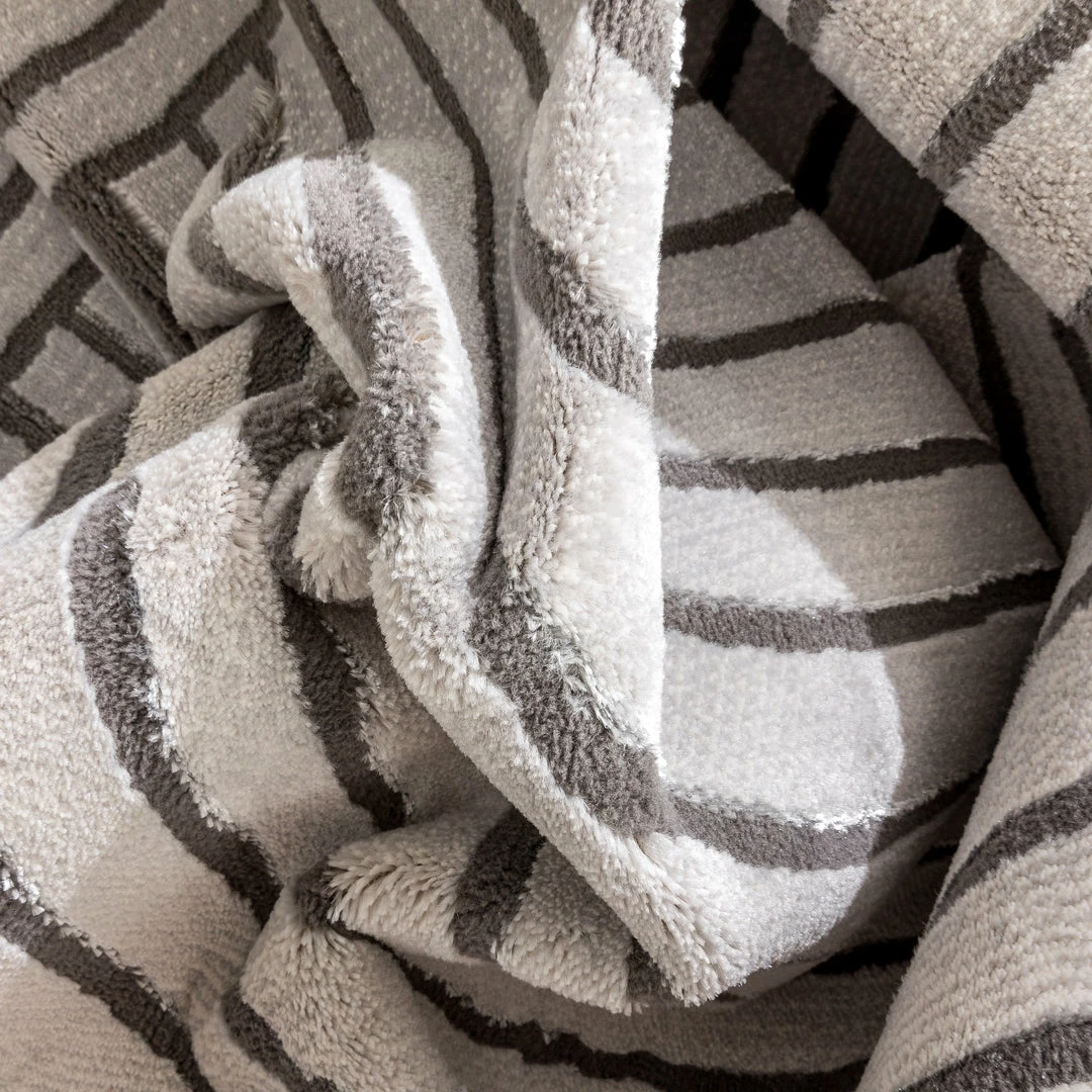 A collection of sleek, abstract designs with a soft hand and modern style. The geometric designs are woven in sharp grey tones, accented with shimmering pops of color, making these nouveau looks the understated companion to chic and glamorous decor.
