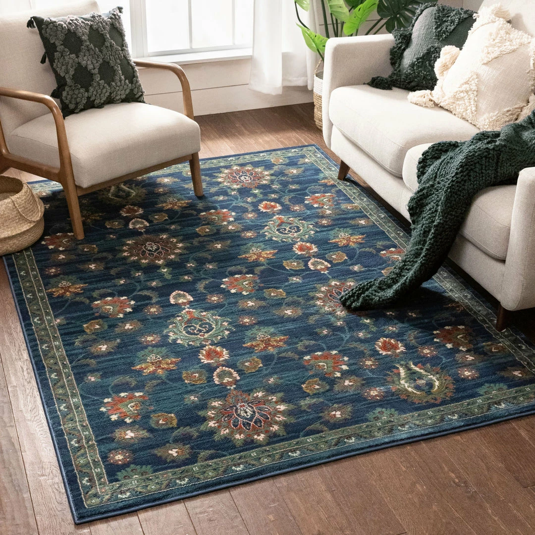 The Tulsa collection draws upon a curated array of traditional Persian, Southwestern, and Moroccan designs. A warm palette of red, blue, and green jewel tones is accented by neutral colors of ivory and beige for a rug that’s easy to match with any decor.