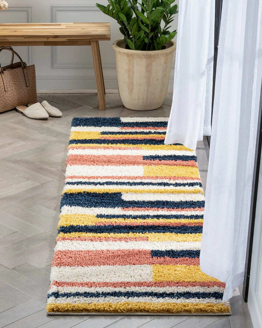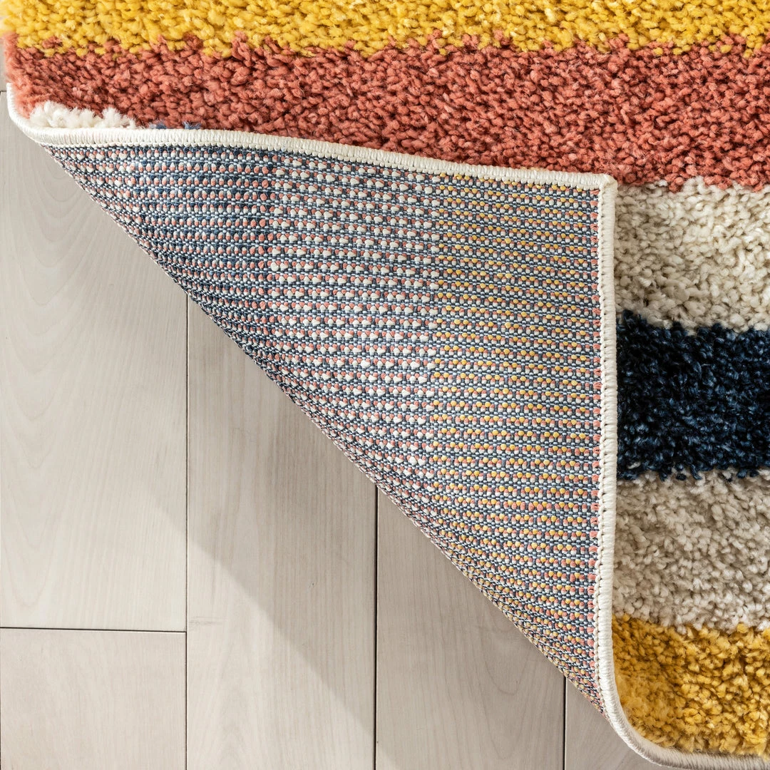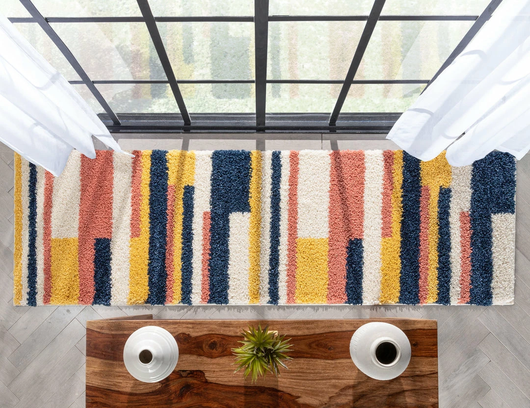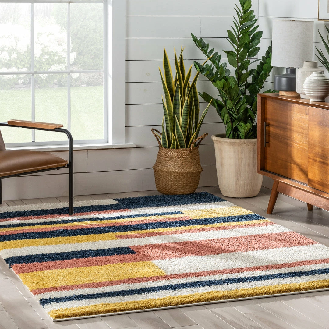 Well Woven Katniss Mid-Century Modern Geometric Ivory Blue Rainbow Shag Rug Vintage