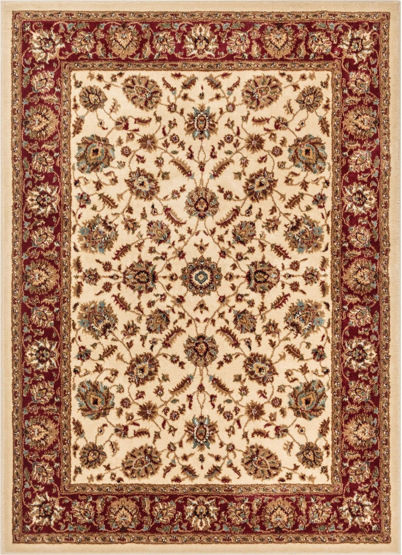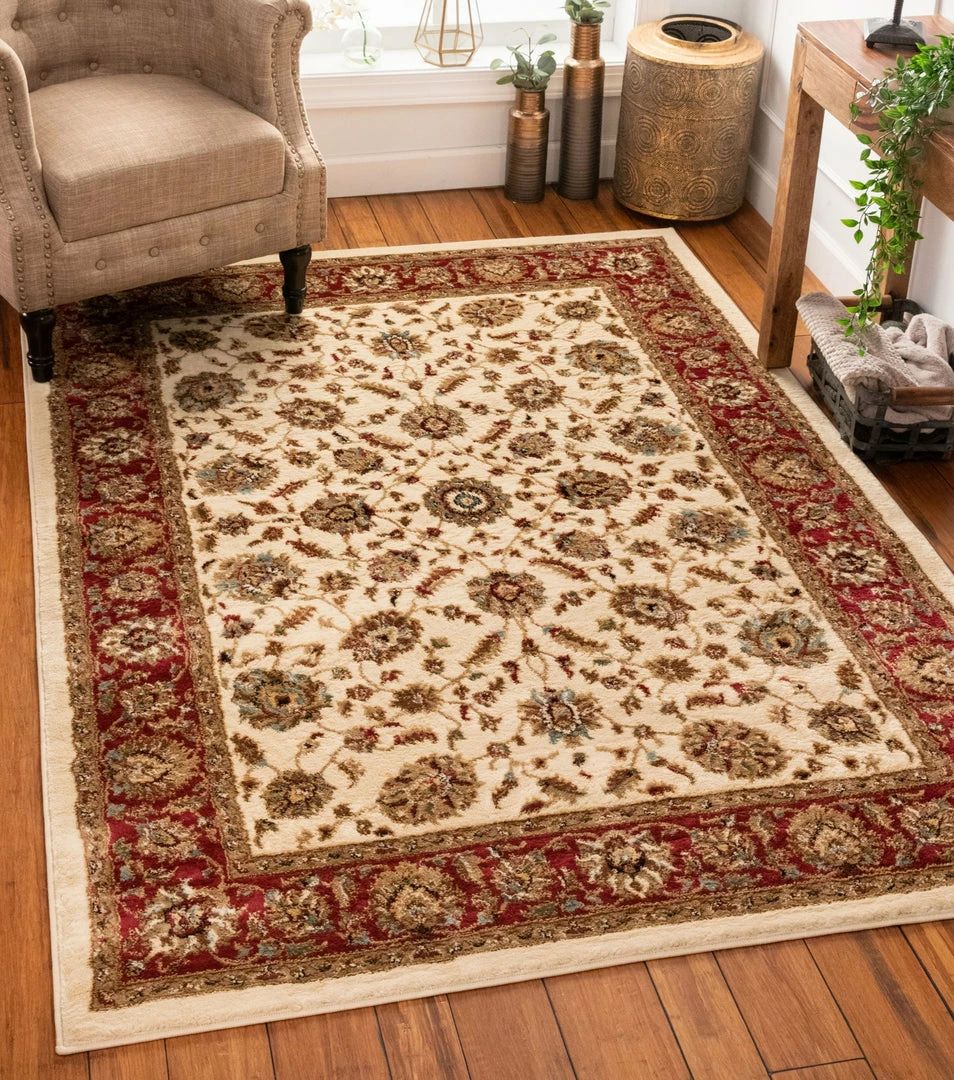 The Aurora collection brings together a curated array of patterns drawn from Modern Contemporary and Persian Oriental styles. A warm palette of red, blue, and green jewel tones is accented by neutral colors of ivory and beige for a rug that’s easy to match with any decor. The heat set polypropylene fiber gives a 0.4″ pile that is soft and stain resistant. The 100% jute backing is safe for wood floors and all four sides of the rug are serged for improved durability.