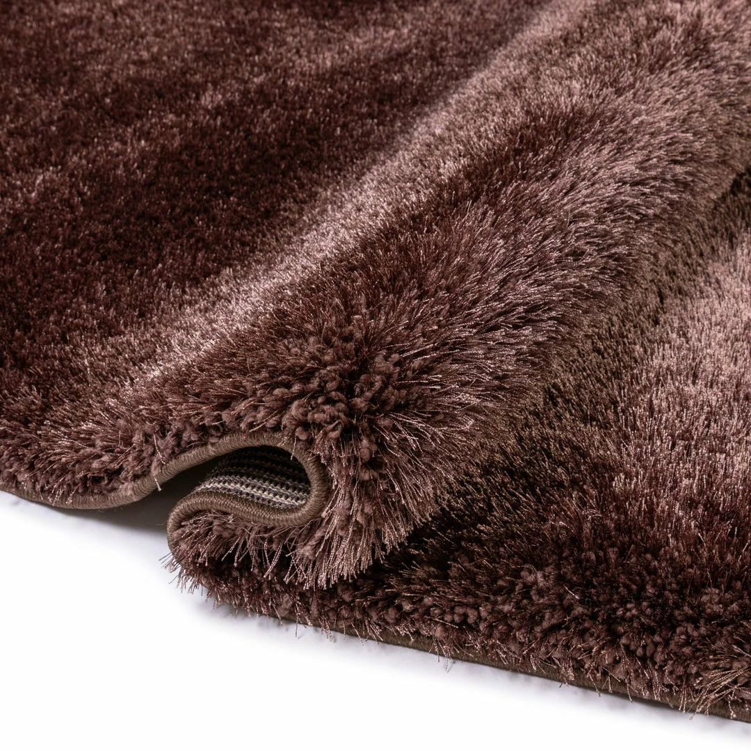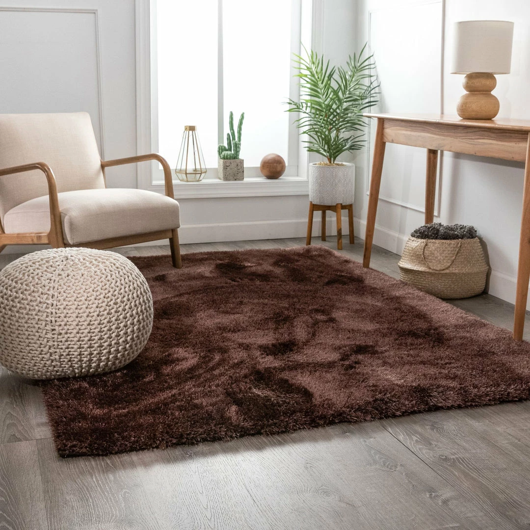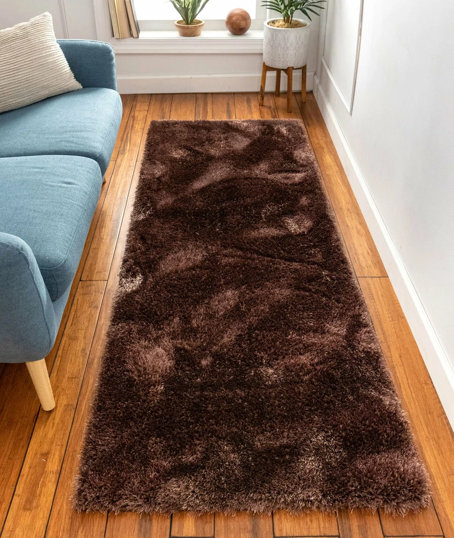This Brown Plush shag rug is perfect for the living room, dining room, bedroom, entryway, hallway, great room, den, family room, nursery, playroom, or children’s room. A mix of two types of 100% polyester fiber gives an exceptional look and silky soft hand.