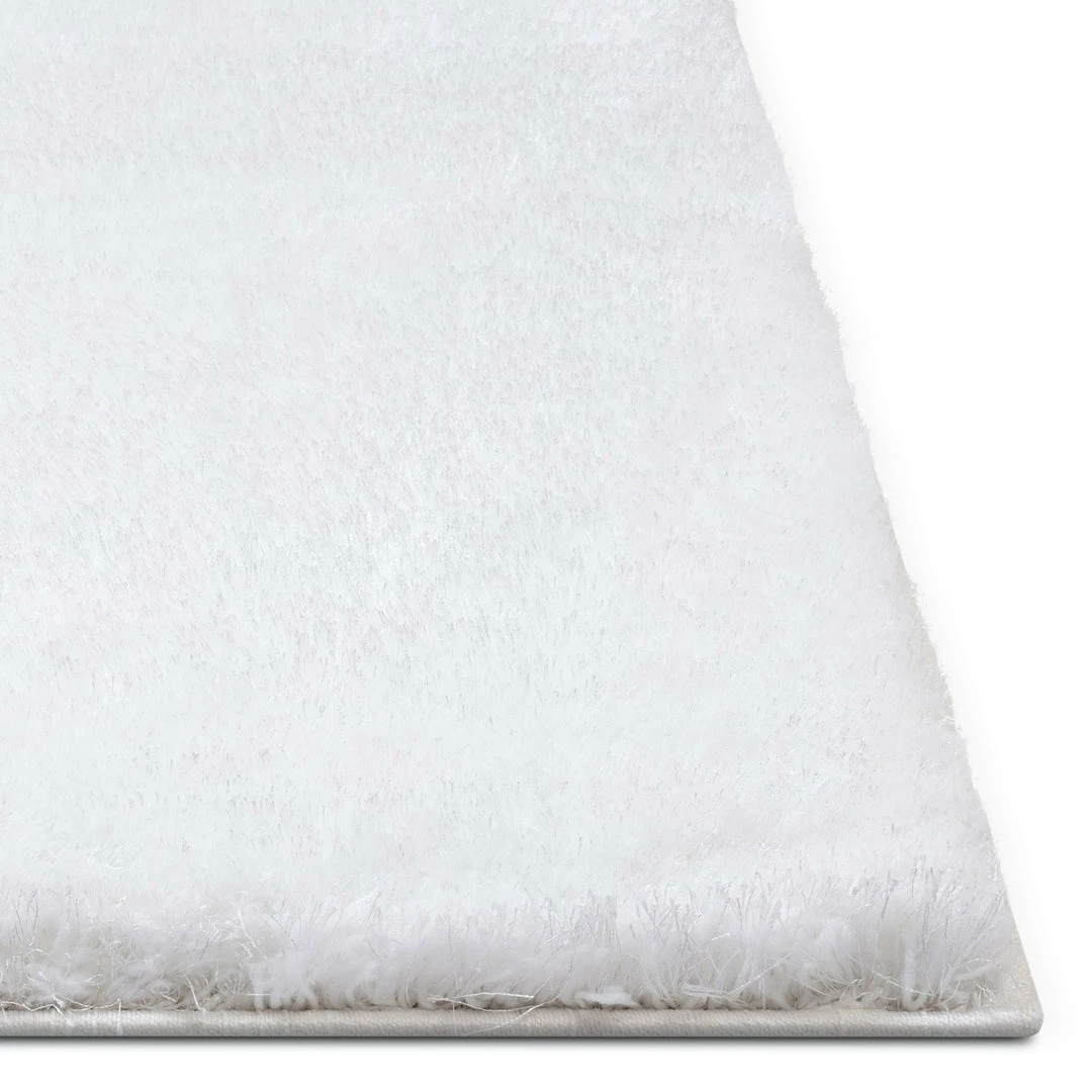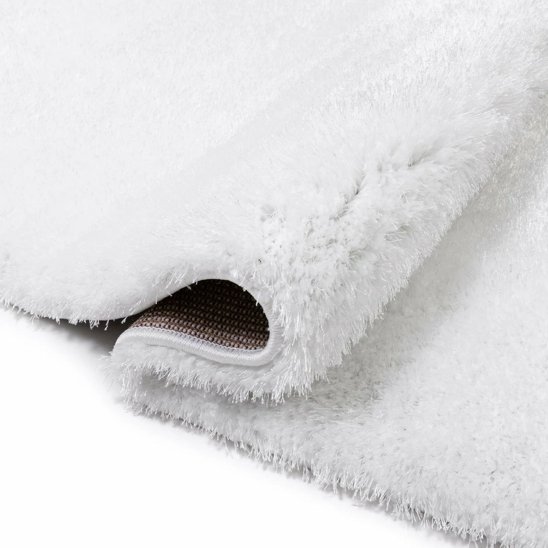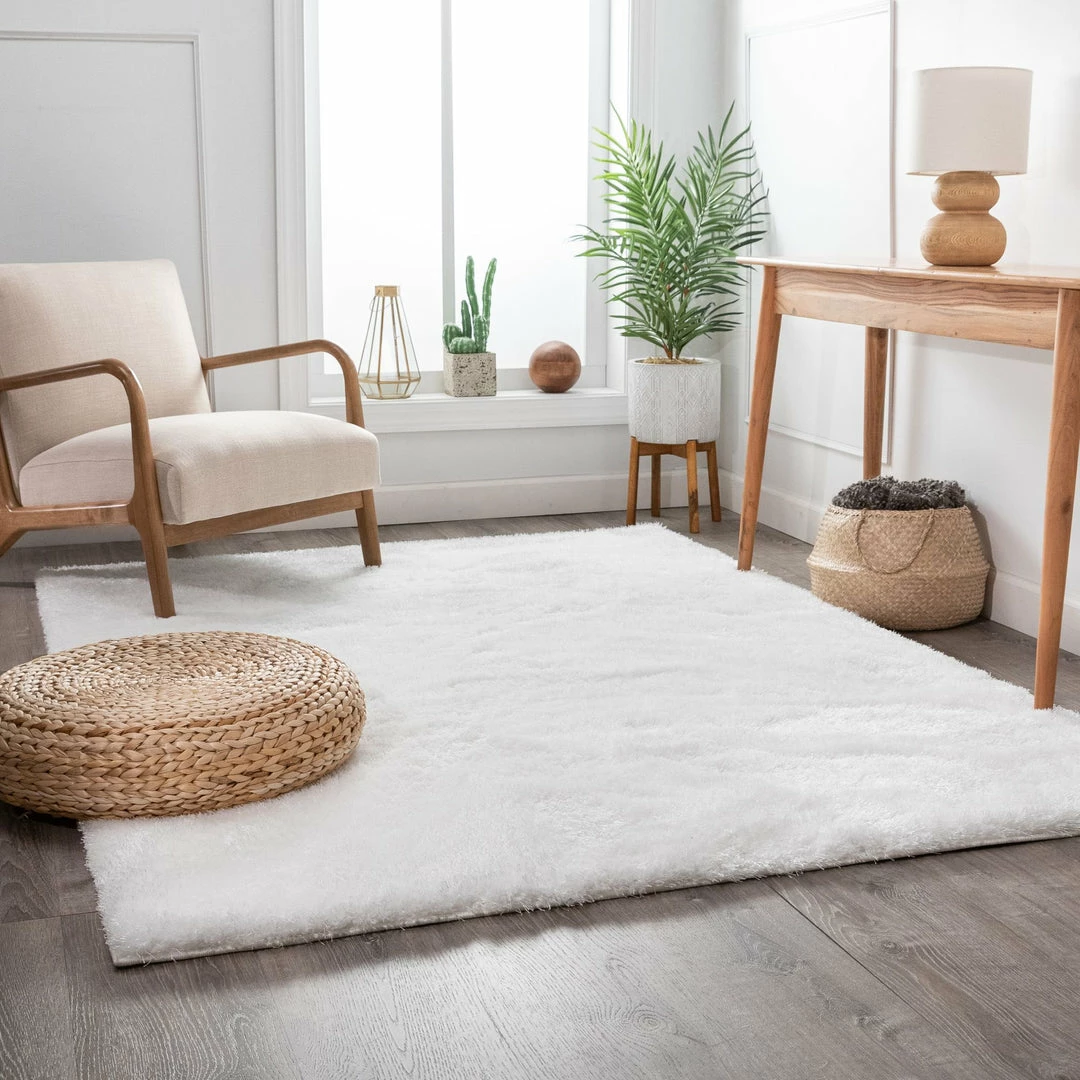 This White Plush shag rug is perfect for the living room, dining room, bedroom, entryway, hallway, great room, den, family room, nursery, playroom, or children’s room. A mix of two types of 100% polyester fiber gives an exceptional look and silky soft hand.