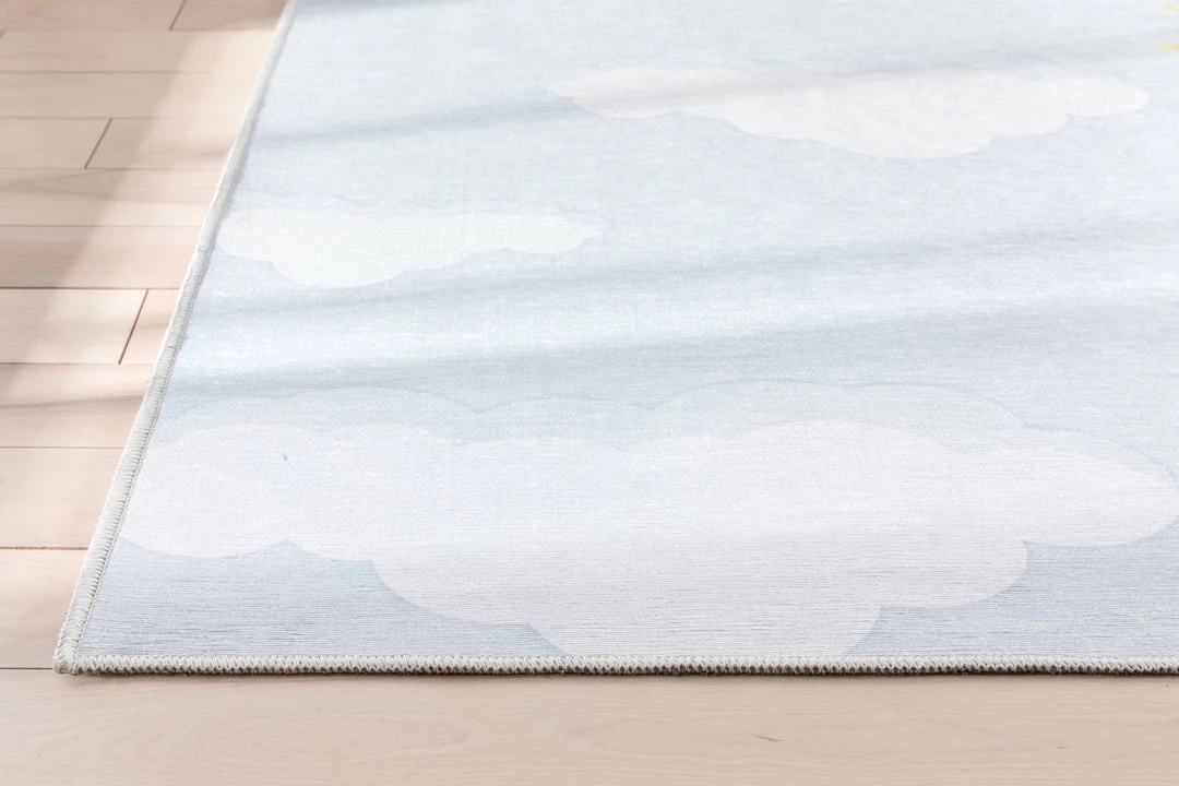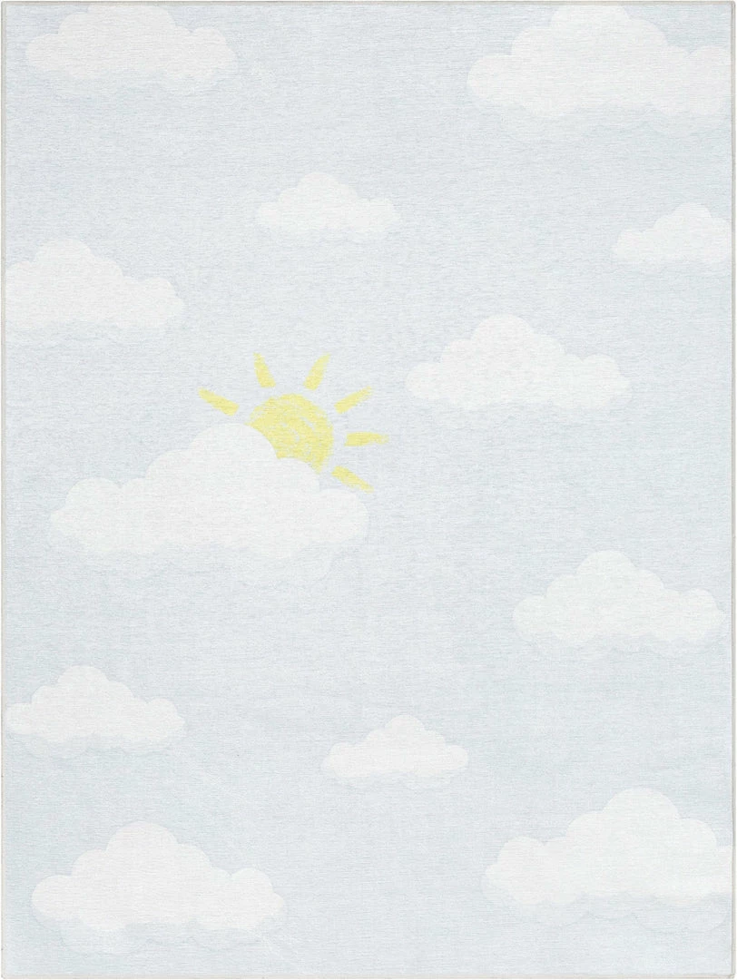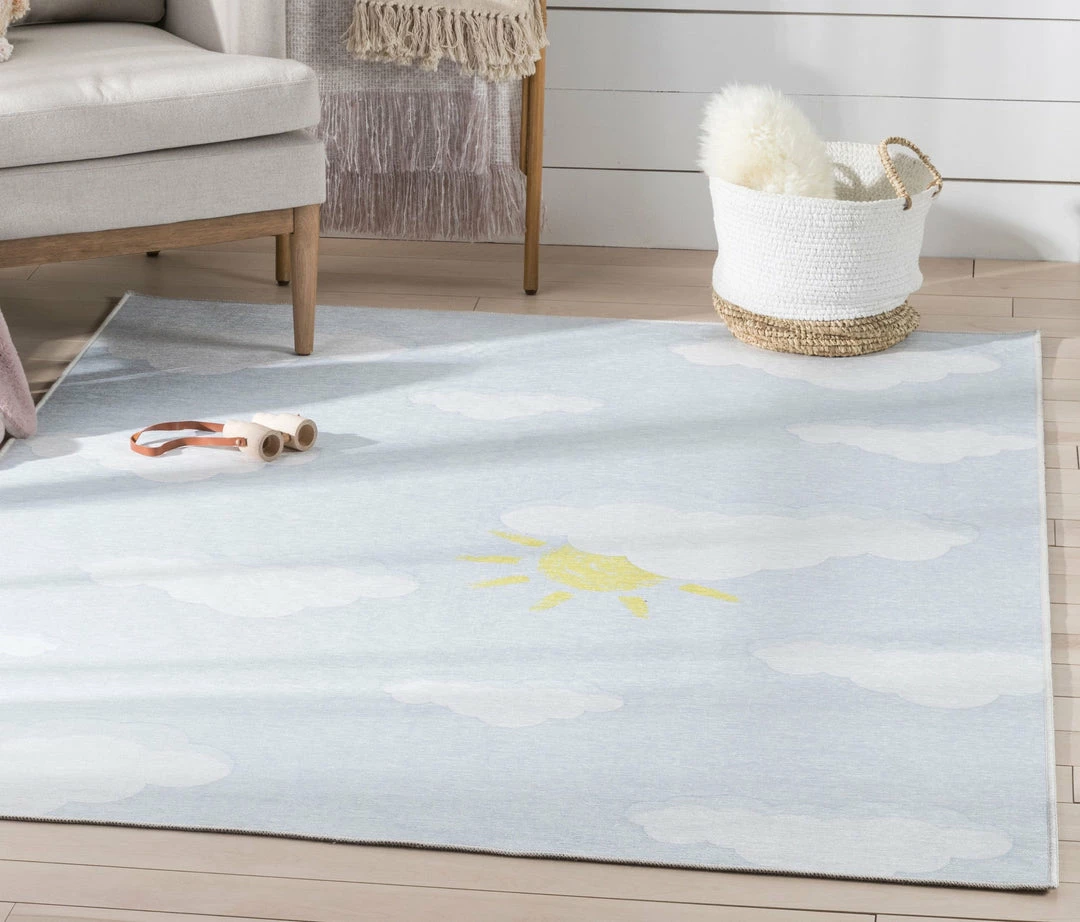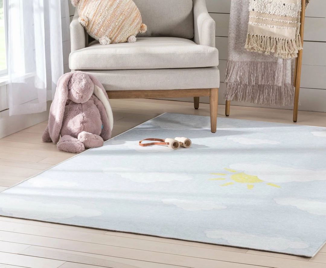 Well Woven Machine Washable Cloud 9 Sun Modern Grey Light Blue Flat-Weave Washable Kids Rug