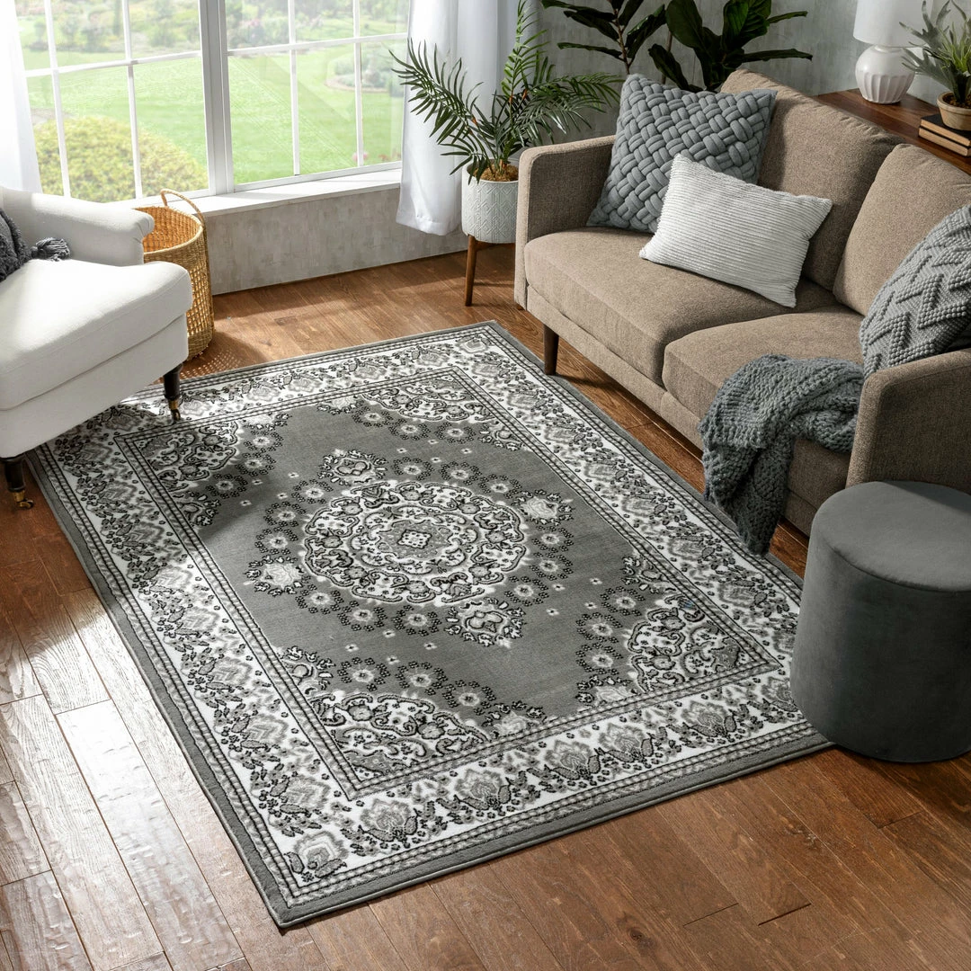 The Persa collection is our way of bringing traditional Persian styles from the courts of ancient dynasties to somewhere a bit more modern and comfortable, like your living room. The patterns of these detailed Sarouks and floral medallions are woven in contemporary palette of vibrant jewel tones, warm beiges and browns, as well as cool blacks and greys. The dense, 0.4″ polypropylene pile is stain and fade resistant. The 100% jute backing is safe for wood floors and all four sides of the rug are serged for improved durability.