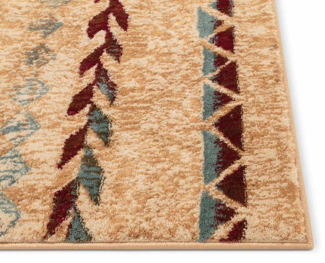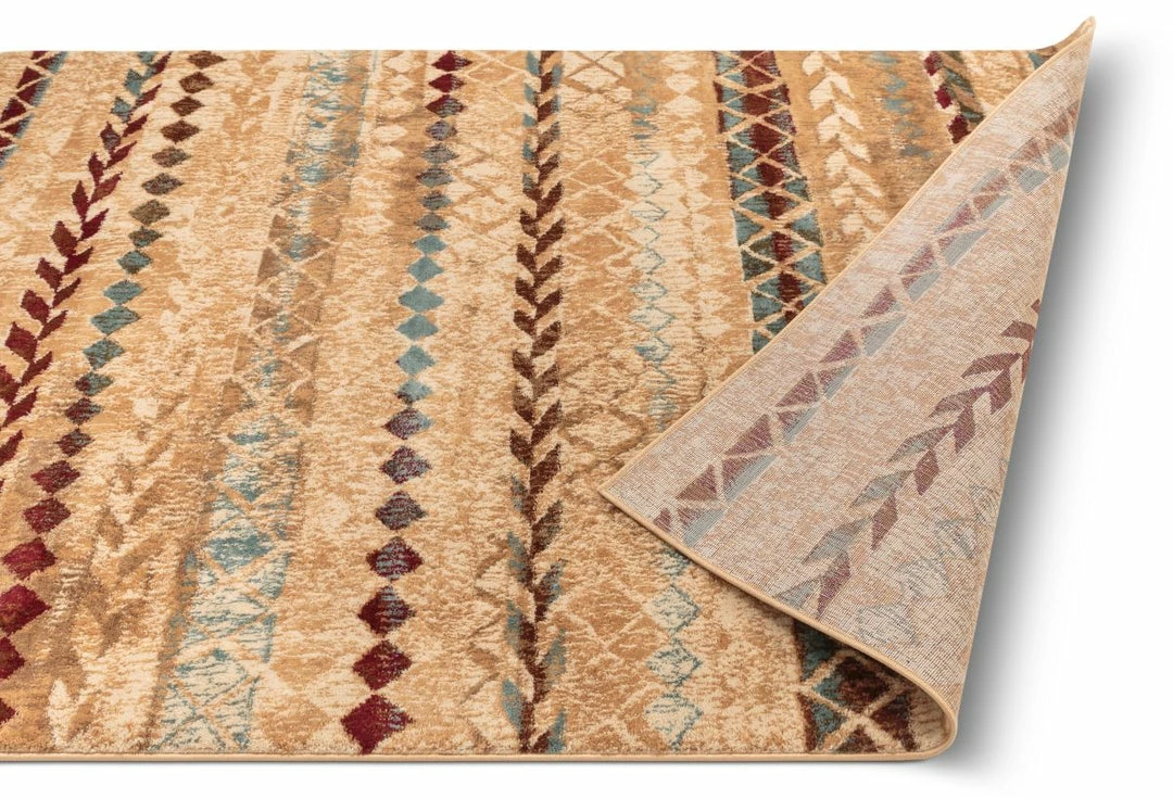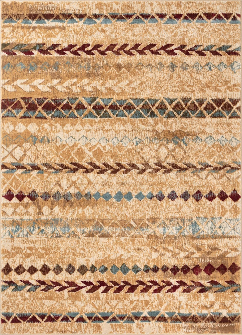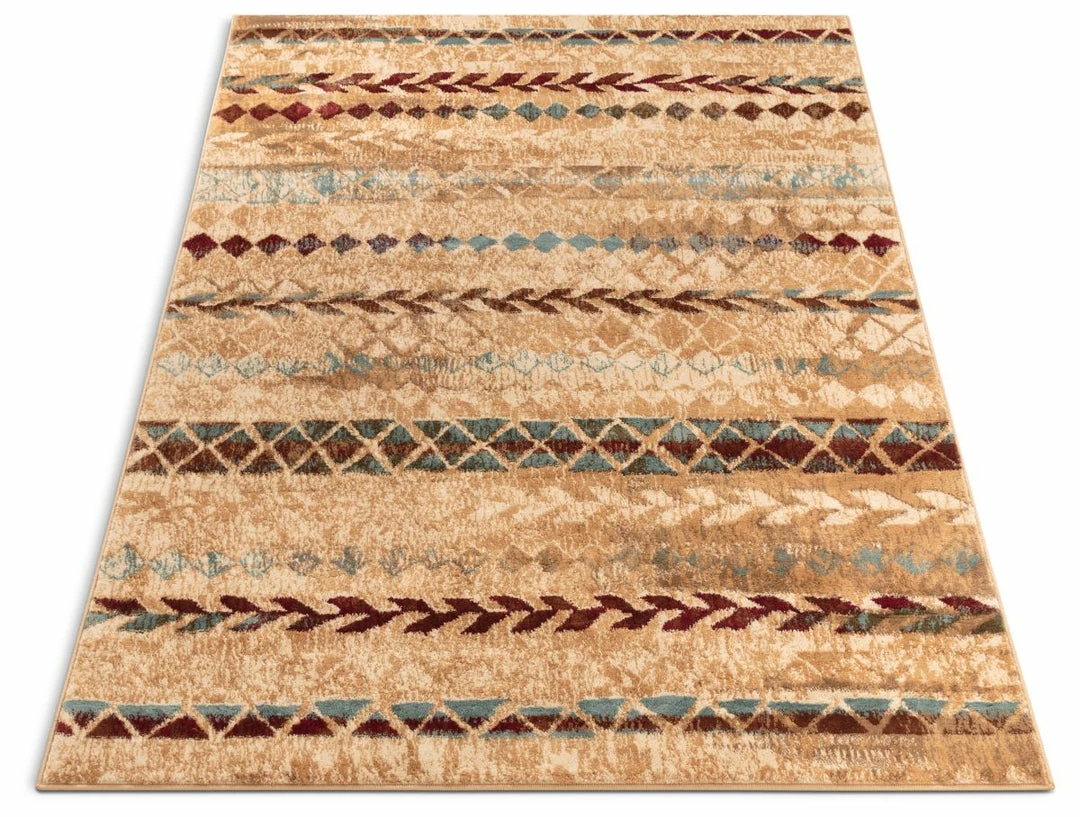 The Aurora collection brings together a curated array of patterns drawn from Modern Contemporary and Persian Oriental styles. A warm palette of red, blue, and green jewel tones is accented by neutral colors of ivory and beige for a rug that’s easy to match with any decor. The heat set polypropylene fiber gives a 0.4″ pile that is soft and stain resistant. The 100% jute backing is safe for wood floors and all four sides of the rug are serged for improved durability.