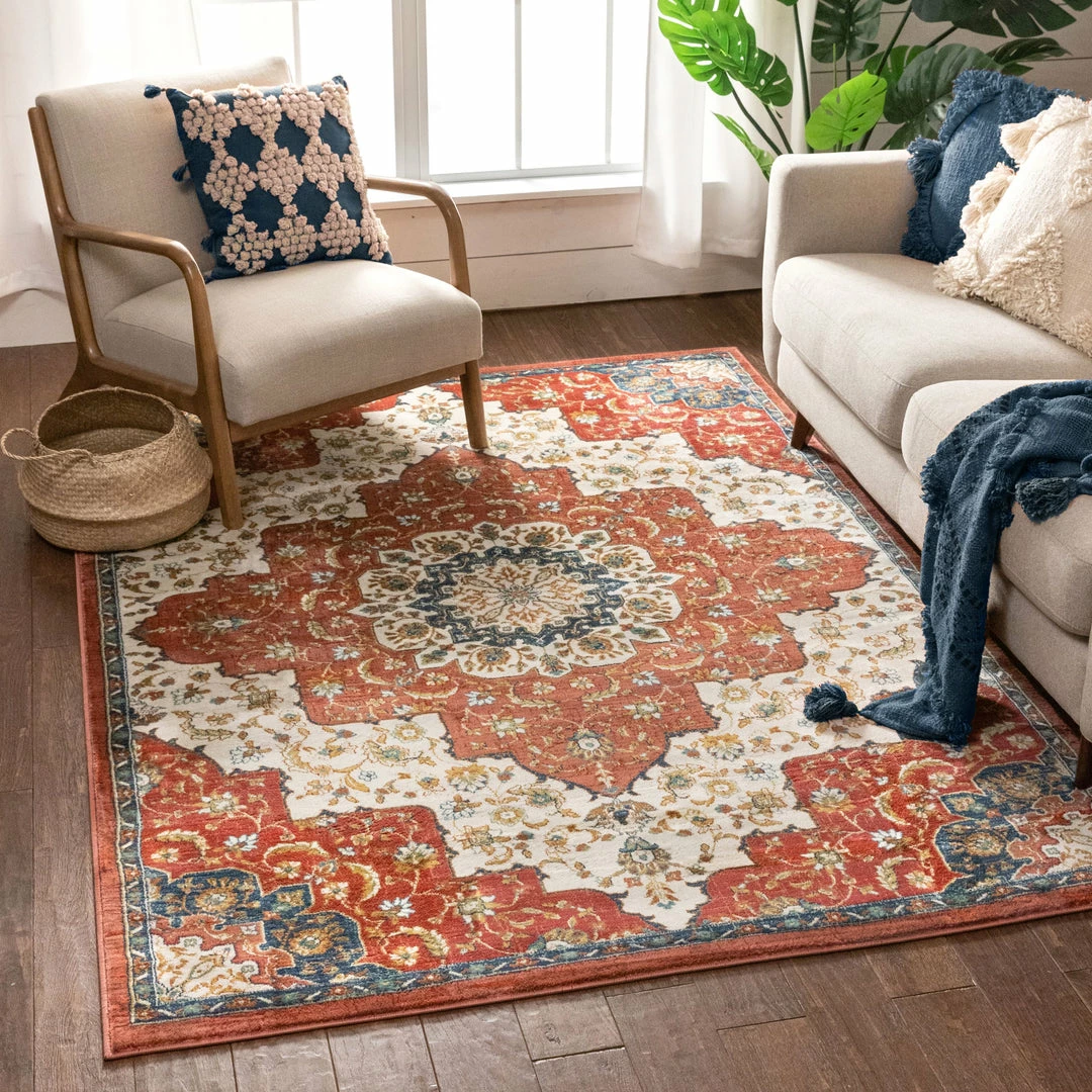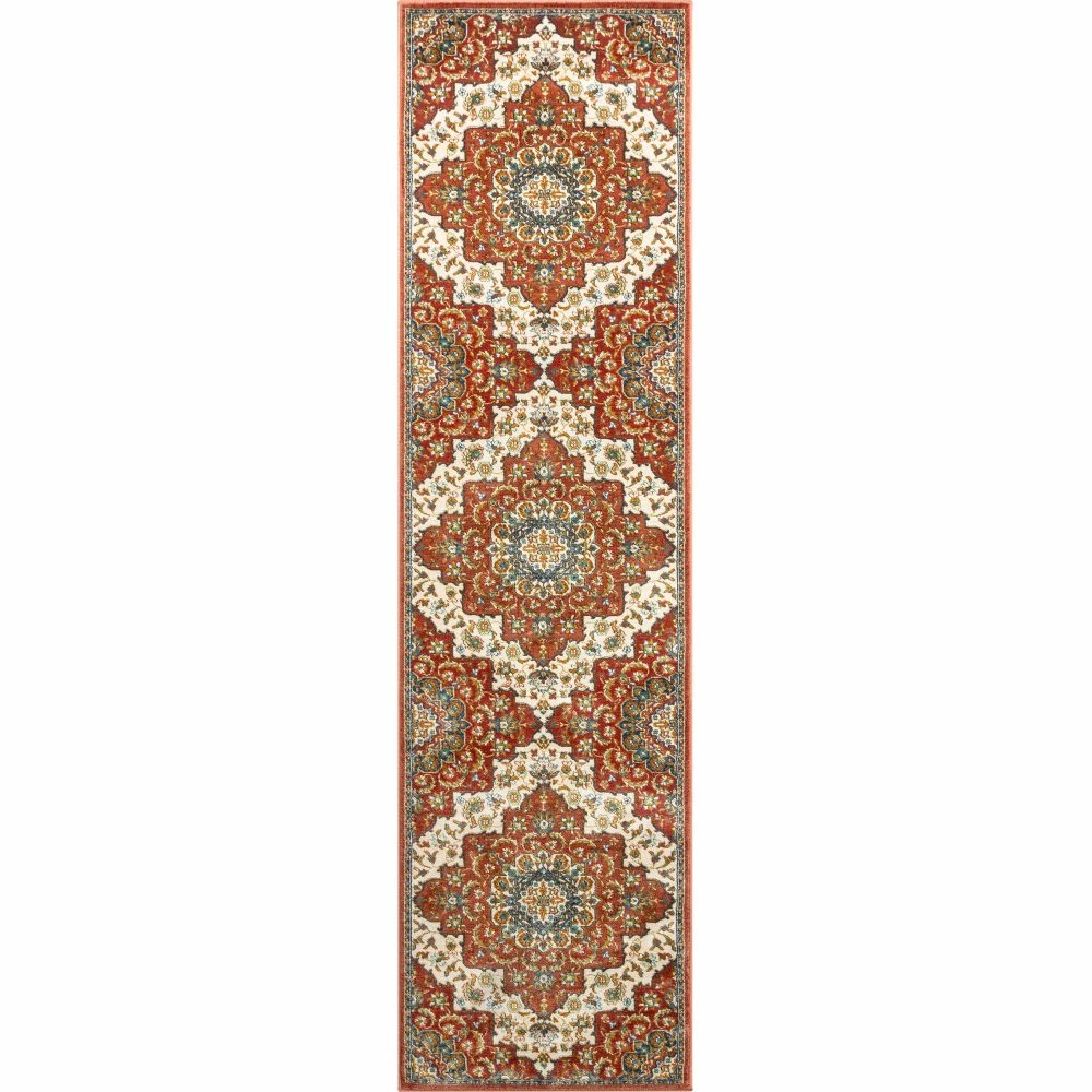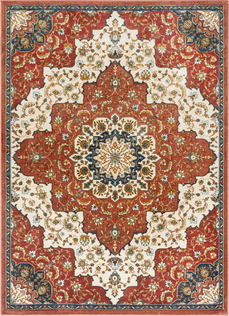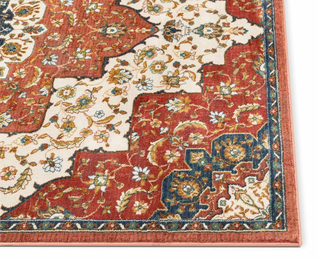 The Tulsa collection draws upon a curated array of traditional Persian, Southwestern, and Moroccan designs. A warm palette of red, blue, and green jewel tones is accented by neutral colors of ivory and beige for a rug that’s easy to match with any decor.