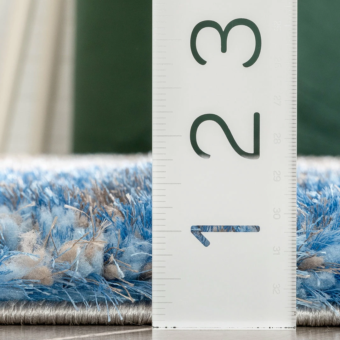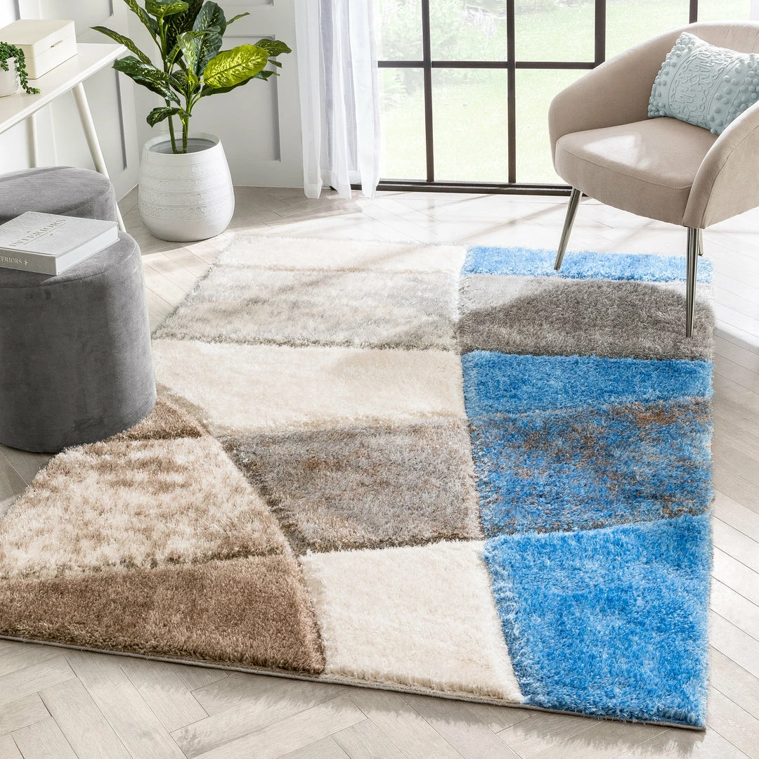 Well Woven Remi Contemporary Geometric Boxes 3D Textured Shag Grey Light Blue Rug