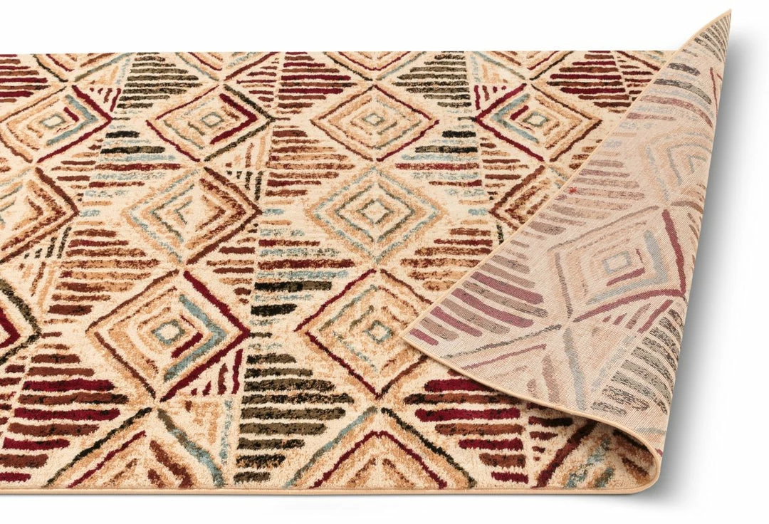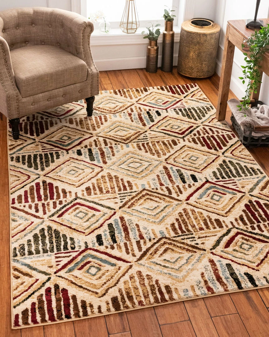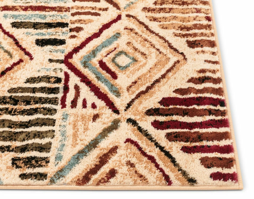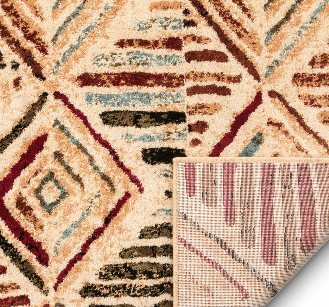 The Aurora collection brings together a curated array of patterns drawn from Modern Contemporary and Persian Oriental styles. A warm palette of red, blue, and green jewel tones is accented by neutral colors of ivory and beige for a rug that’s easy to match with any decor. The heat set polypropylene fiber gives a 0.4″ pile that is soft and stain resistant. The 100% jute backing is safe for wood floors and all four sides of the rug are serged for improved durability.